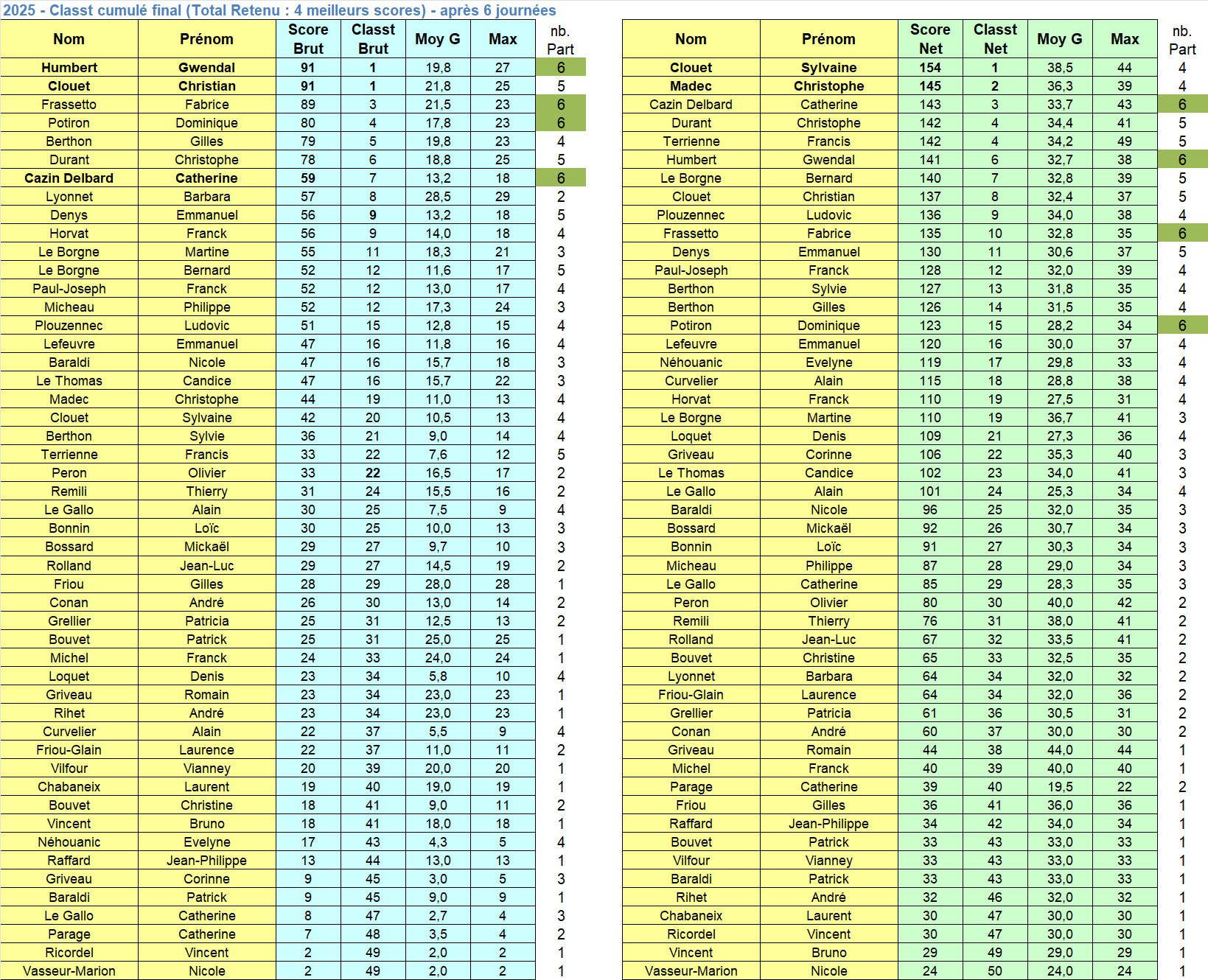 Le classement cumulé a évolué : en tête du général, Fabrice a pris la tête avec 1 point d’avance sur Christian C. et 6 sur Gwendal pour le brut. La 1ere chez les femmes pour le brut reste Catherine C., suivie à 2 pts par Barbara (avec seulement 2 parties !). En net, Catherine C et Christophe D. (qui récupère la 2e place) mènent la danse. Mais pour le résultat final, tout se jouera à Savenay.