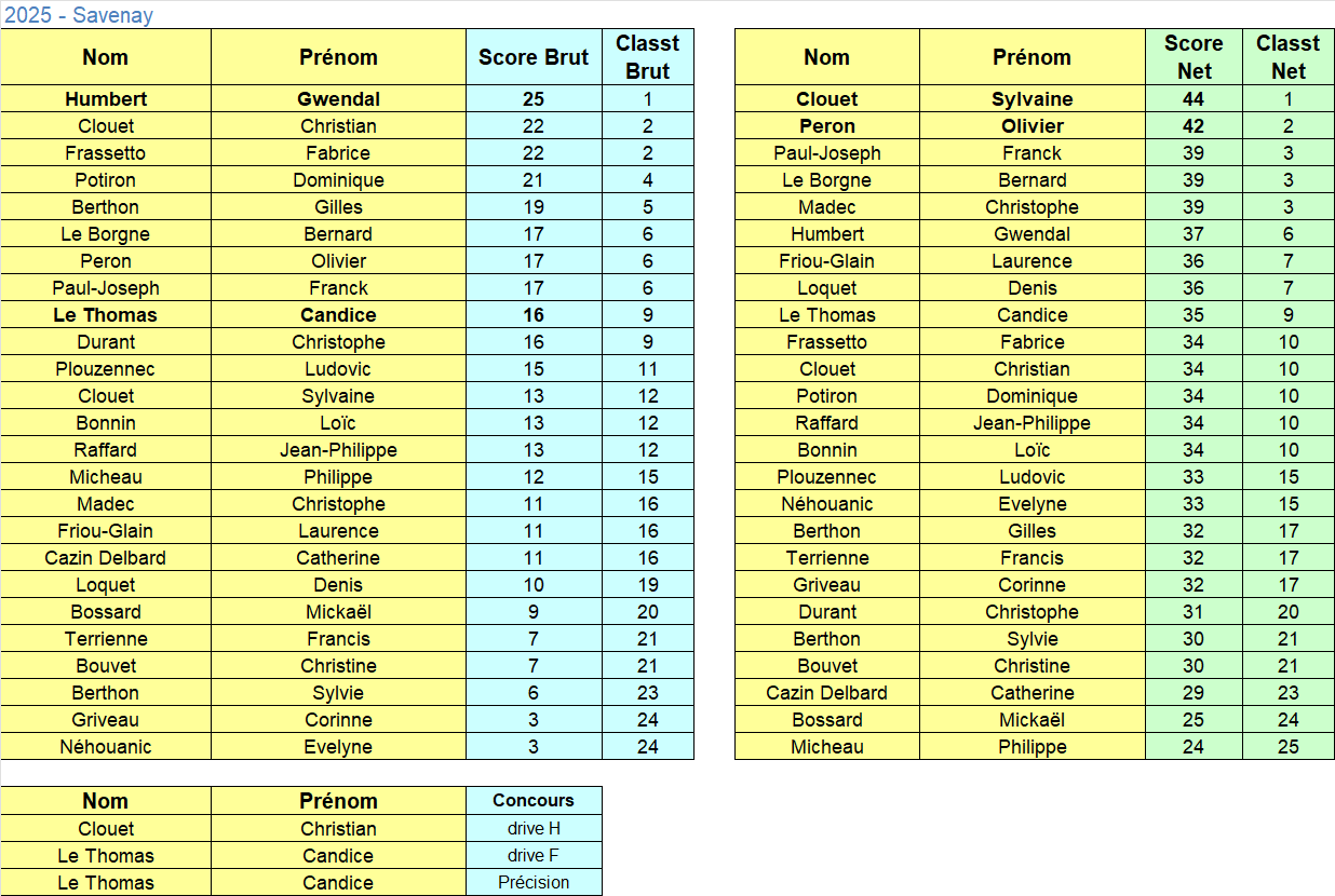 Du point de vue sportif, pas de réelles performances, mais quelques scores honorables et 2 baisses d’index (Catherine L. et Fabrice). N'oublions pas que c'est une reprise. En tout cas le challenge 2025 est lancé ! Félicitations aussi à Barbara, Christophe M. pour les concours de Drive F et H, et à Gwendal pour la précision.