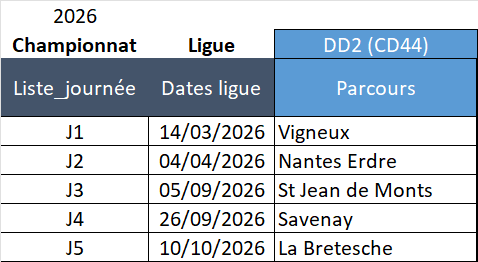 Le championnat Départemental se déroule aux mêmes journées que le championnat Ligue (2 équipes 2FOPEN-44 en 2025).