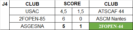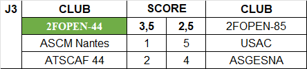 Très belle victoire de la DR3, 5.5 à 0.5 contre la 2FOPEN-85. Bravo donc à la belle équipe, composée de Dominique P., Christian, Fabrice et Gilles B. Comme la DR2, très belle entame et 5 points déjà au compteur.
