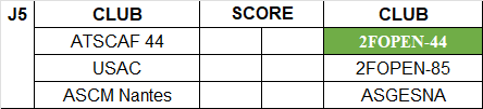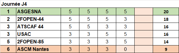 J4 à Nantes Erdre : Bravo à l'équipe (Fabrice, Gilles B., Martine (dont c'était la reprise), et Dominique L.) qui obtient une large victoire 5 à 1, qui permet de passer seul en tête (Orange ayant fait math nul). Une victoire lors de la dernière journée (14/10) permettra donc la montée en D3 (les D2 et D3 se déplacent sur les mêmes parcours ce qui permettrait aux 2 équipes de se cotoyer toute l'année)