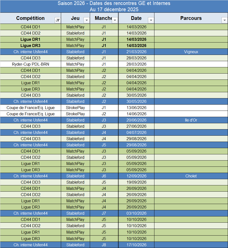 Enjeu 2026 : La volonté du bureau est de poursuivre la dynamique à tous les niveaux : poursuivre la très bonne tenue des équipes en Golf Entreprises (en conservant l'assiduité 2025 de tous pour maintenir nos ambitions - rappelons que le club contribue à la cotisation imposée par la 2FOPEN nationale), reconduction du challenge Usfen 44, reconduire notre journée d'ouverture pour nous retrouver et lancer la saison, favoriser les échanges et les activités entre les membres, poursuivre et enrichir la lettre d'information (L'écho des Greens), ...